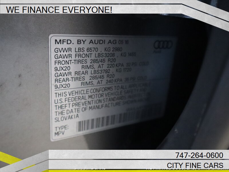 We are happy to offer this beautiful and sharp 2017 AUDI Q7 3.0T QUATTRO PREMIUM ! We offer financing to EVERYONE whether you have GOOD. BAD, NO CREDIT, OR TIN NUMBER, WE CAN FINANCE YOU WITH THE BEST RATES. LOWEST RATES FOR WHATEVER YOUR CREDIT SITUATION IS. Call us today to set up your test drive towards ownership. To ensure your complete satisfaction, we strongly advise, as it is your responsibility to verify with the dealer that all the details listed, including complete vehicle specifications and price are accurate, vehicles location and availability preferably before visiting our location. We do not warrant the accuracy of the options and specifications the vehicles we sell come with. Vehicle availability and price are subject to change at any given time. Please feel free to call (747)-264-0600.