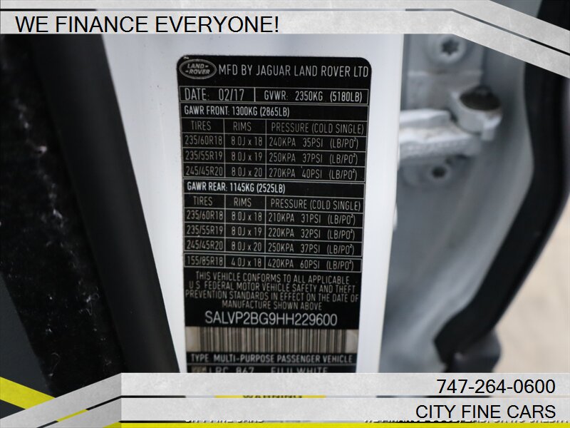 We are happy to offer this beautiful and sharp 2017 LAND ROVER RANGE ROVER EVOQUE SE PREMIUM ! We offer financing to EVERYONE whether you have GOOD. BAD, NO CREDIT, OR TIN NUMBER, WE CAN FINANCE YOU WITH THE BEST RATES. LOWEST RATES FOR WHATEVER YOUR CREDIT SITUATION IS. Call us today to set up your test drive towards ownership. To ensure your complete satisfaction, we strongly advise, as it is your responsibility to verify with the dealer that all the details listed, including complete vehicle specifications and price are accurate, vehicles location and availability preferably before visiting our location. We do not warrant the accuracy of the options and specifications the vehicles we sell come with. Vehicle availability and price are subject to change at any given time. Please feel free to call (747)-264-0600.