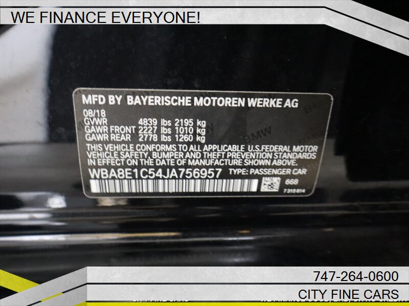 We are happy to offer this beautiful and sharp 2018 BMW 330e iPERFORMANCE ! We offer financing to EVERYONE whether you have GOOD. BAD, NO CREDIT, OR TIN NUMBER, WE CAN FINANCE YOU WITH THE BEST RATES. LOWEST RATES FOR WHATEVER YOUR CREDIT SITUATION IS. Call us today to set up your test drive towards ownership. Listed price excludes tax, documentation fee, smog and DMV fees. To ensure your complete satisfaction, we strongly advise, as it is your responsibility to verify with the dealer that all the details listed, including complete vehicle specifications and price are accurate, vehicles location and availability preferably before visiting our location. We do not warrant the accuracy of the options and specifications the vehicles we sell come with. Vehicle availability and price are subject to change at any given time. Please feel free to call (747)-264-0600.