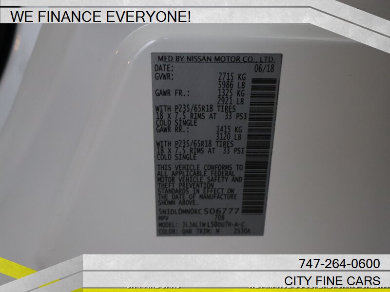 We are happy to offer this beautiful and sharp 2019 INFINITI QX60 LUXE ! We offer financing to EVERYONE whether you have GOOD. BAD, NO CREDIT, OR TIN NUMBER, WE CAN FINANCE YOU WITH THE BEST RATES. LOWEST RATES FOR WHATEVER YOUR CREDIT SITUATION IS. Call us today to set up your test drive towards ownership. Listed price excludes tax, documentation fee, smog and DMV fees. To ensure your complete satisfaction, we strongly advise, as it is your responsibility to verify with the dealer that all the details listed, including complete vehicle specifications and price are accurate, vehicles location and availability preferably before visiting our location. We do not warrant the accuracy of the options and specifications the vehicles we sell come with. Vehicle availability and price are subject to change at any given time. Please feel free to call (747)-264-0600.