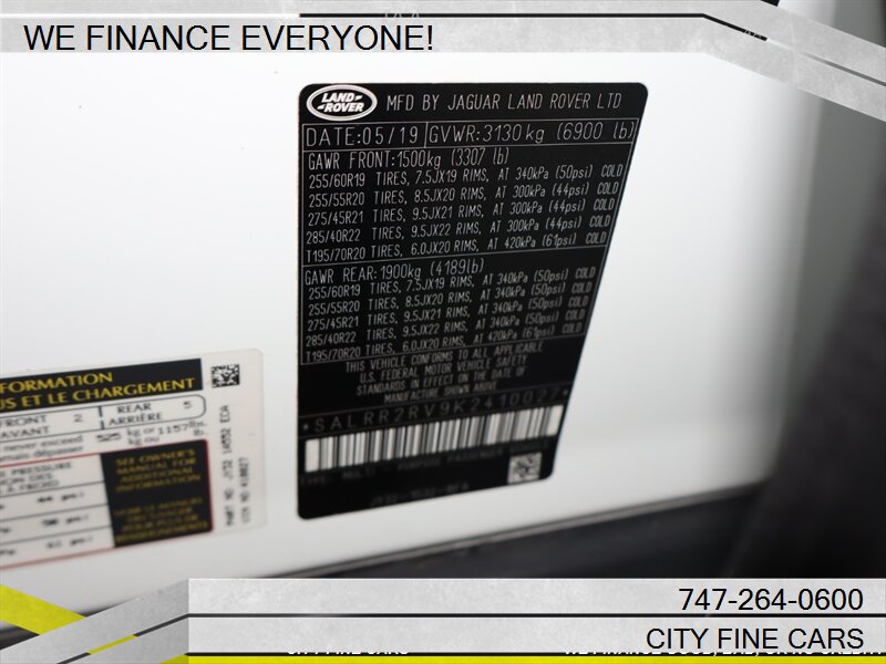 We are happy to offer this beautiful and sharp 2019 LAND ROVER DISCOVERY HSE ! We offer financing to EVERYONE whether you have GOOD. BAD, NO CREDIT, OR TIN NUMBER, WE CAN FINANCE YOU WITH THE BEST RATES. LOWEST RATES FOR WHATEVER YOUR CREDIT SITUATION IS. Call us today to set up your test drive towards ownership. Listed price excludes tax, documentation fee, smog and DMV fees. To ensure your complete satisfaction, we strongly advise, as it is your responsibility to verify with the dealer that all the details listed, including complete vehicle specifications and price are accurate, vehicles location and availability preferably before visiting our location. We do not warrant the accuracy of the options and specifications the vehicles we sell come with. Vehicle availability and price are subject to change at any given time. Please feel free to call (747)-264-0600.