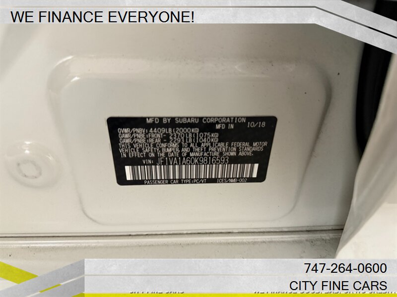 **NO HIDDEN FEES, NO AFTERMARKET ACCESSORIES, NO UNECCESARY CHARGES, OUR SALES PRICE IS THE REAL PRICE** We are happy to offer this beautiful and sharp 2019 SUBARU WRX (MANUAL) ! We offer financing to EVERYONE whether you have GOOD. BAD, NO CREDIT, OR TIN NUMBER, WE CAN FINANCE YOU WITH THE BEST RATES. LOWEST RATES FOR WHATEVER YOUR CREDIT SITUATION IS. Call us today to set up your test drive towards ownership. Listed price excludes tax, documentation fee, smog and DMV fees. To ensure your complete satisfaction, we strongly advise, as it is your responsibility to verify with the dealer that all the details listed, including complete vehicle specifications and price are accurate, vehicles location and availability preferably before visiting our location. We do not warrant the accuracy of the options and specifications the vehicles we sell come with. Vehicle availability and price are subject to change at any given time. Please feel free to call (747)-264-0600.
